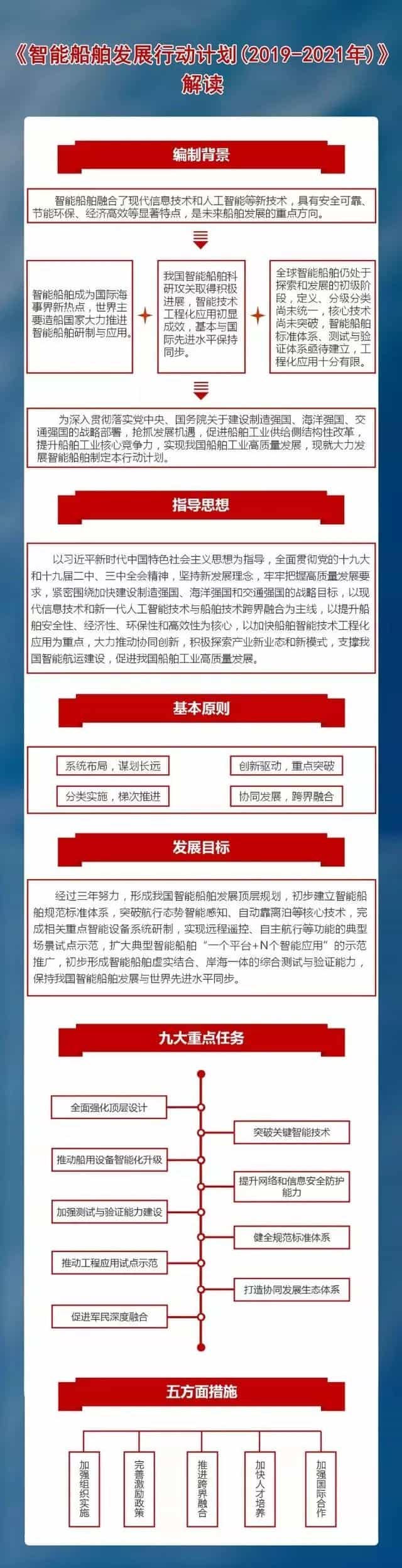 為深入貫徹落實(shí)黨中央、國(guó)務(wù)院關(guān)于建設(shè)制造強(qiáng)國(guó)、海洋強(qiáng)國(guó)、交通強(qiáng)國(guó)的戰(zhàn)略部署,搶抓發(fā)展機(jī)遇,促進(jìn)船舶工業(yè)供給側(cè)結(jié)構(gòu)性改革,提升船舶工業(yè)核心競(jìng)爭(zhēng)力,實(shí)現(xiàn)我國(guó)船舶工業(yè)高質(zhì)量發(fā)展,工業(yè)和信息化部聯(lián)合交通運(yùn)輸部、國(guó)防科工局編制印發(fā)了《智能船舶發(fā)展行動(dòng)計(jì)劃(2019-2021年)》。