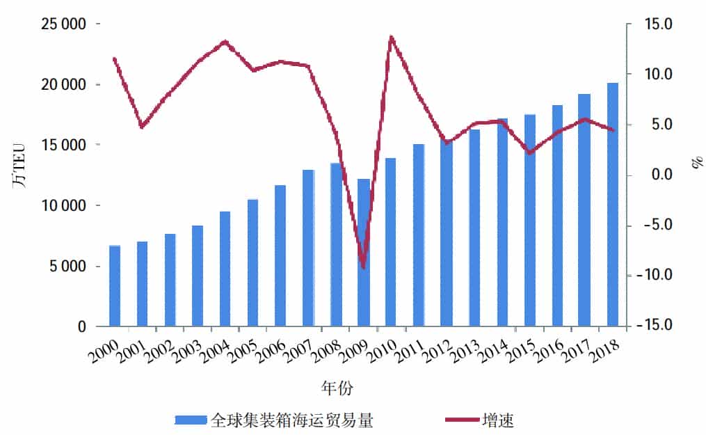2018年全球集裝箱海運貿易出現小幅下滑,全年集裝箱海運量為2.01億TEU,年度增速降至4.5%,較2017年下降一個百分點。