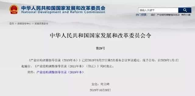 11月6日,國家發展改革委官網發布《產業結構調整指導目錄(2019年本)》。該《目錄》已經2019年8月27日第2次委務會議審議通過,現予公布,自2020年1月1日起施行。《產業結構調整指導目錄(2011年本)(修正)》同時廢止。