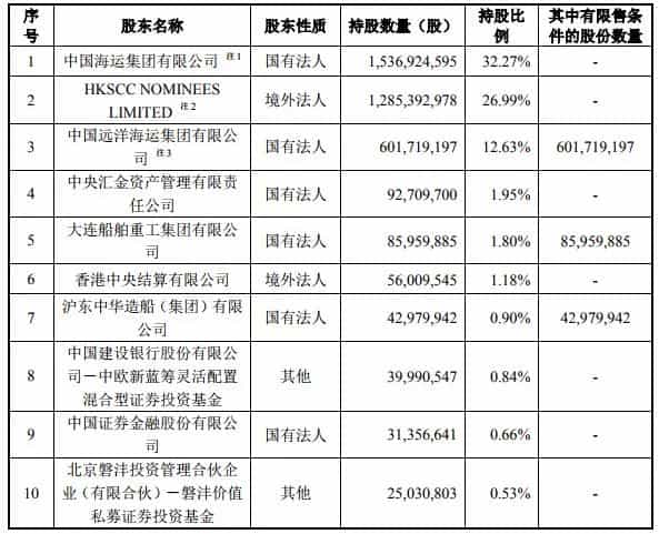 本次發行完成后,中遠海能將新增有限售條件流通股7.3億股,總股本增至47.6億股。其中中遠海運集團對中遠海能的持股比例由38.56%上升至45.28%,包括通過中國海運集團間接持有的中遠海能股權比例32.64%,以及直接持有股權比例12.63%,仍為中遠海能的間接控股股東。另外,大船集團對中遠海能的持股比例為1.8%,在中遠海能前10名股東中持股比例排名第五。滬東中華對中遠海能的持股比例為0.9%,在前10名股東中持股比例排名第七。