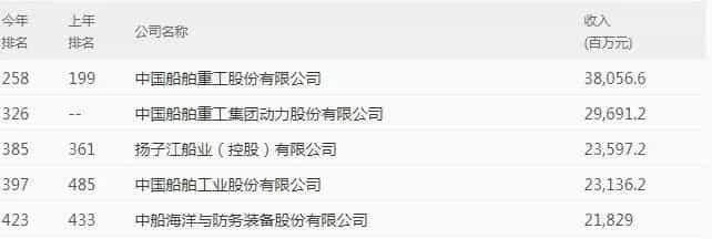 在船舶領(lǐng)域中,上榜企業(yè)包括:中國船舶重工股份有限公司、中國船舶重工集團(tuán)動(dòng)力股份有限公司、揚(yáng)子江船業(yè)(控股)有限公司、中國船舶工業(yè)股份有限公司、中船海洋與防務(wù)裝備股份有限公司,500強(qiáng)的排名分別是258名、326名、385名、397名和423名。其中,中國船舶重工集團(tuán)動(dòng)力股份有限公司首次上榜。揚(yáng)子江船業(yè)再次入圍,同時(shí)也是入圍500強(qiáng)中唯一一家民營船企。