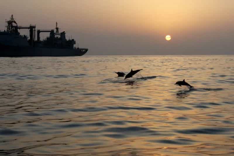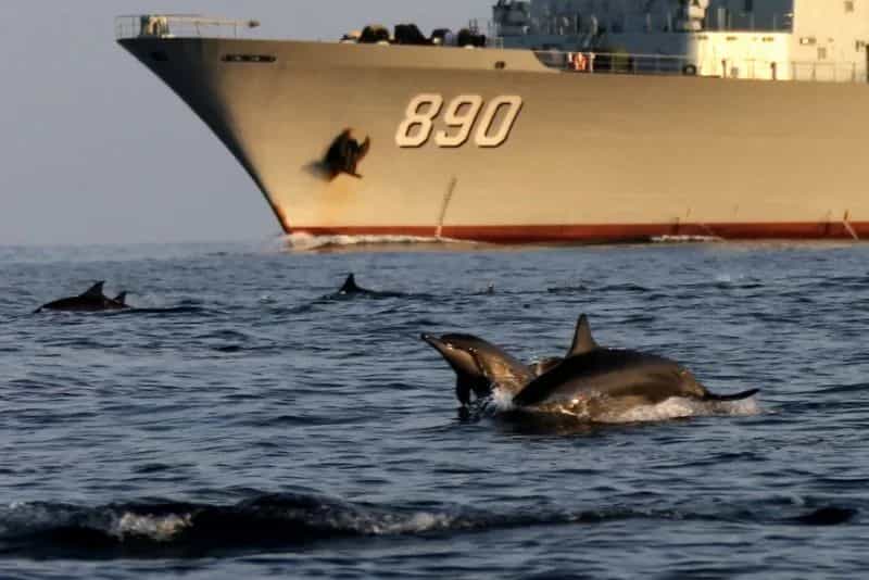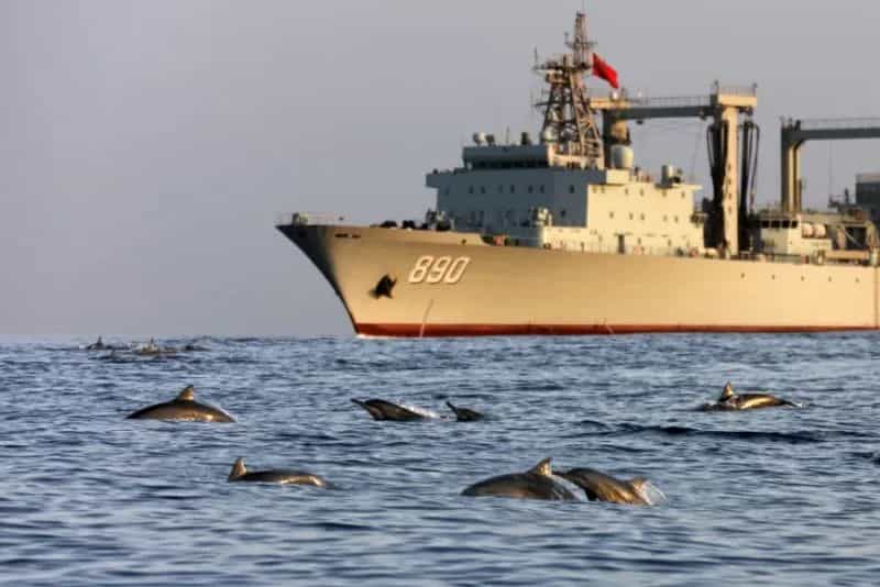 中國海軍赴亞丁灣索馬里海域護航編隊始終秉持海洋命運共同體理念,堅持人與大海和諧相處,注重生態環境保護,經常出現編隊艦艇航行時有成群海豚伴航、待機集結時有各類魚群相伴的和諧場景。