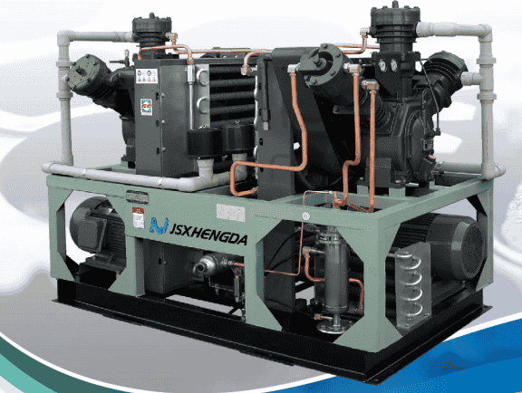 江蘇恒達生產的高壓艦、船用壓縮機在中國船用壓縮機領域實現了大跨越,通過現代壓縮機的最新技術,將螺桿活塞串聯高壓空氣壓縮機,前置螺桿機作為低壓組,增大氣量,以此起到減少壓縮級數的作用,高壓級采用三級壓縮的活塞機組,電機通過皮帶分別將動力傳遞給活塞機和螺桿機,使得低壓機組與高壓機組同時工作,并實現空氣的高壓壓縮。