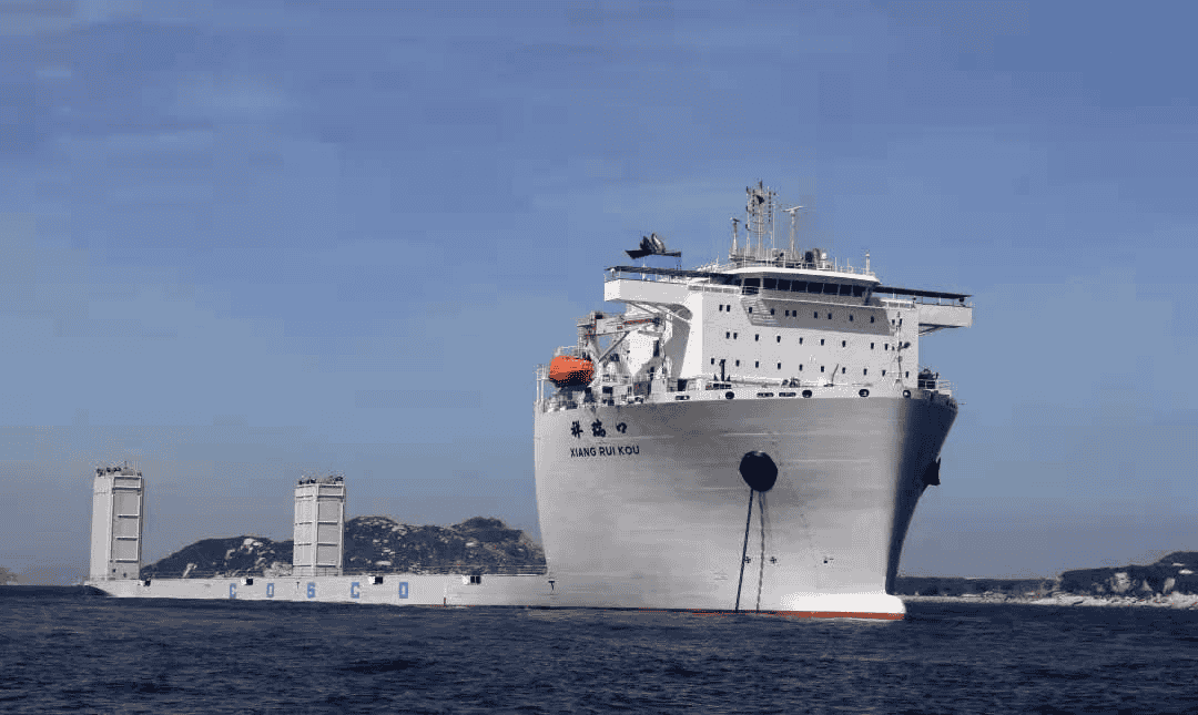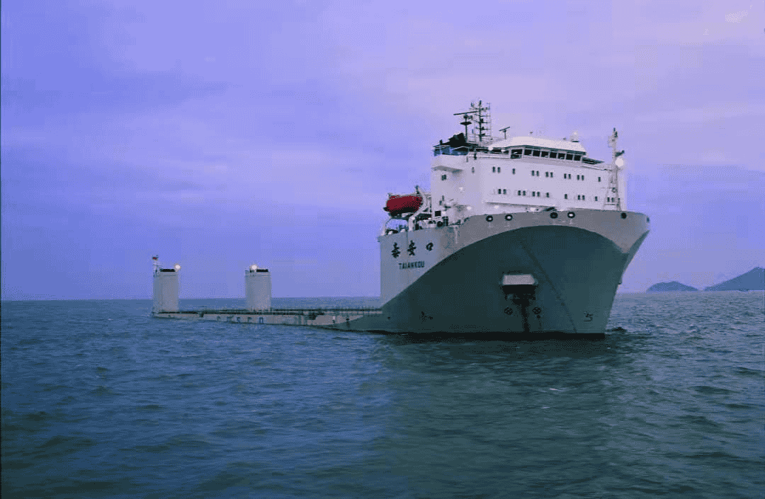 “泰安口”號由中國船舶集團有限公司旗下廣船國際有限公司建造,于2002年交付,該船總長156米,型寬36米,型深10米,貨物甲板面積4500平方米,可在海上垂直下潛至19米,主要用于托運大型海工鋼結構件、海上石油開采平臺、艦船等。該船也是我國建造的首艘半潛船,填補了我國造船業的空白。