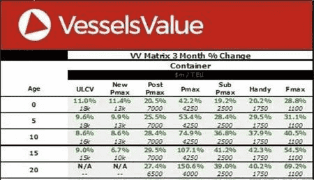 VesselsValue統(tǒng)計今年3-5月集裝船船價值變化情況