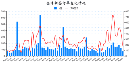 最新全球造船月報出爐,根據克拉克森最新數據統計(截至2021年9月10日),2021年8月份全球新簽訂單74艘,共計1797745CGT。
