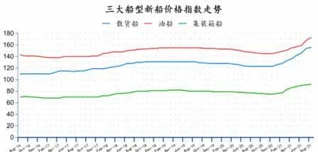 8月份散貨船、油船和集裝箱船新船價格指數分別上升2點、5點和1點至156點、173點和92點。除好望角型散貨船新船價格環比持平外,其余各型散貨船新船價格環比均有所上升。