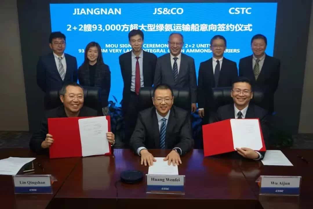 近日,中國船舶集團有限公司旗下江南造船(集團)有限責任公司聯合中國船舶工業貿易有限公司與JS & Co視頻簽署了2+2艘93000立方米超大型綠氨運輸船(VLAC)合作備忘錄。