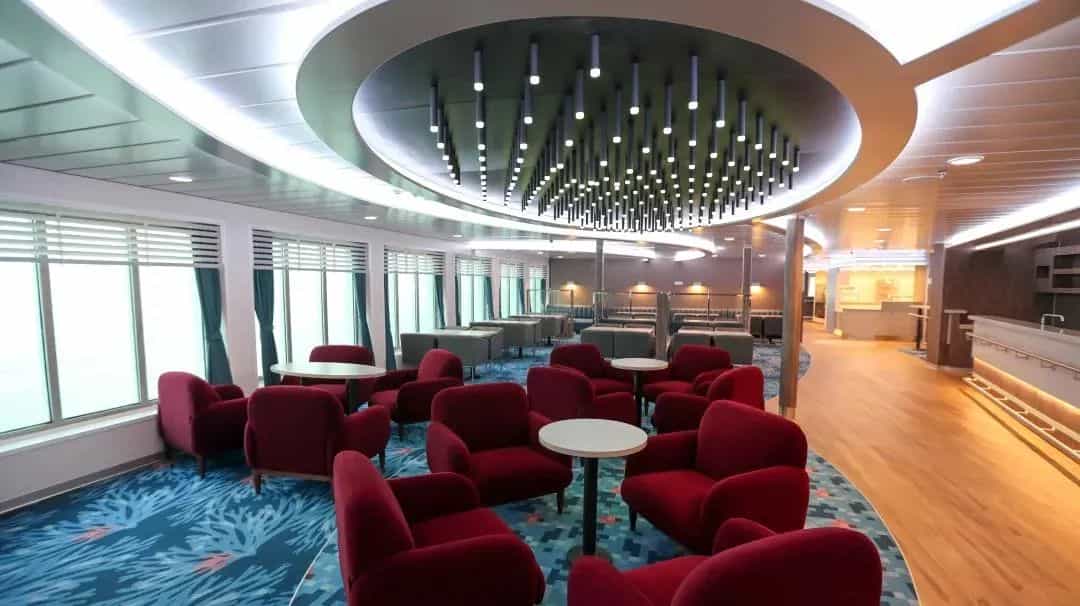 該船集眾多船舶制造領域的前沿科技于一身,綜合性能達到世界領先水平。在舒適性方面,該船振動噪音滿足LR乘客和船員居住舒適性(PCAC)二級標準要求。該船全速前進時,旅客在上層建筑幾乎聽不見任何發動機噪聲,大部分客房在船舶正常航行時噪音只有30多分貝,能給乘客帶來安靜舒適的乘坐體驗。該船車道總長達4500米,可容納約271輛卡車,并配備半自動化綁扎裝置,可實現大型拖車即停即走,省去了繁瑣的綁扎工作。