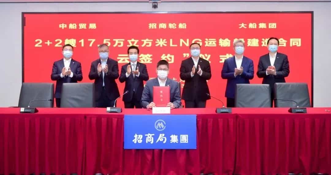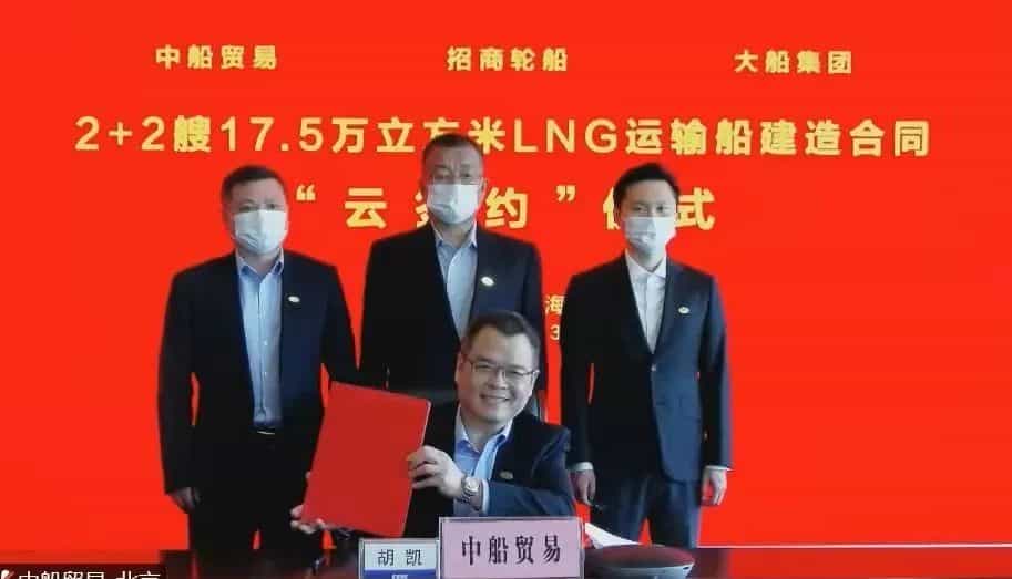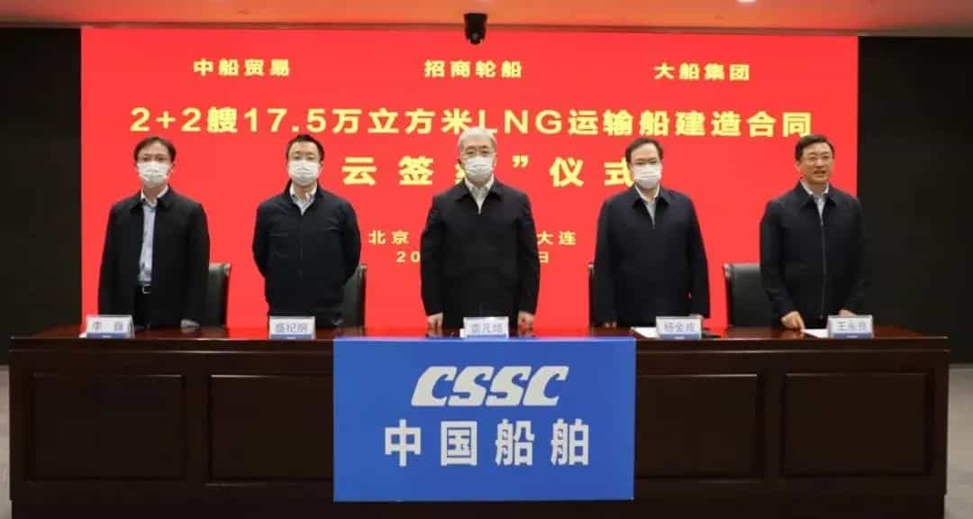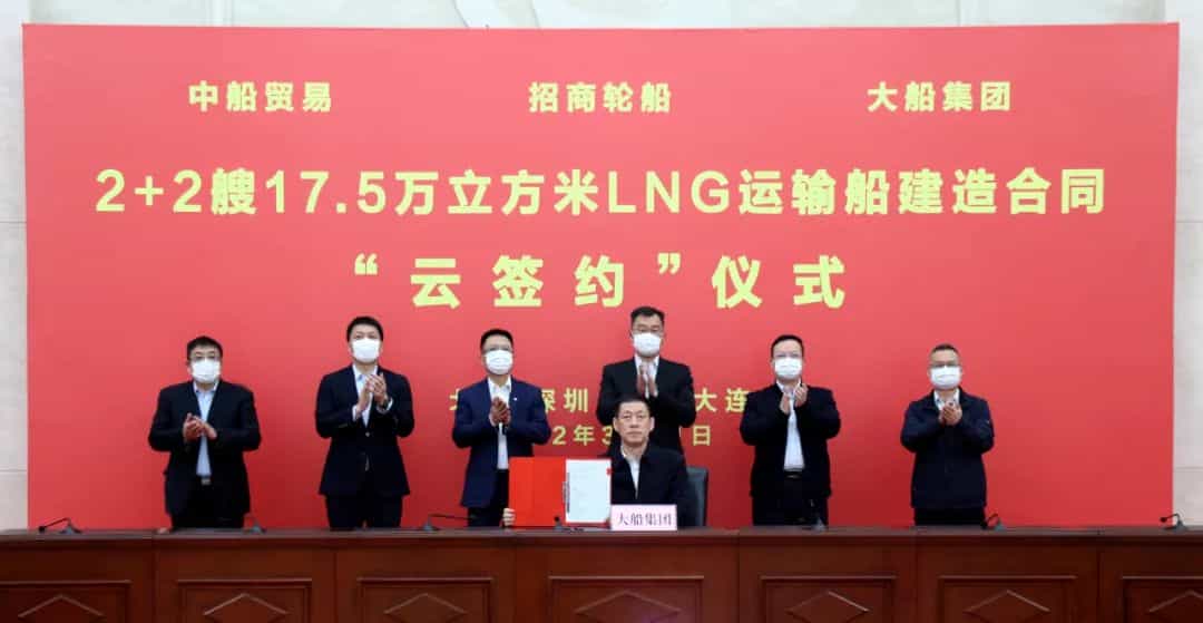 3月31日,中國船舶集團有限公司旗下大連船舶重工集團有限公司聯合中國船舶工業貿易有限公司,與招商局集團有限公司旗下招商局能源運輸股份有限公司在上海、深圳、大連及北京四地以“云簽約”方式正式簽署2+2艘17.5萬立方米大型液化天然氣(LNG)運輸船建造合同。