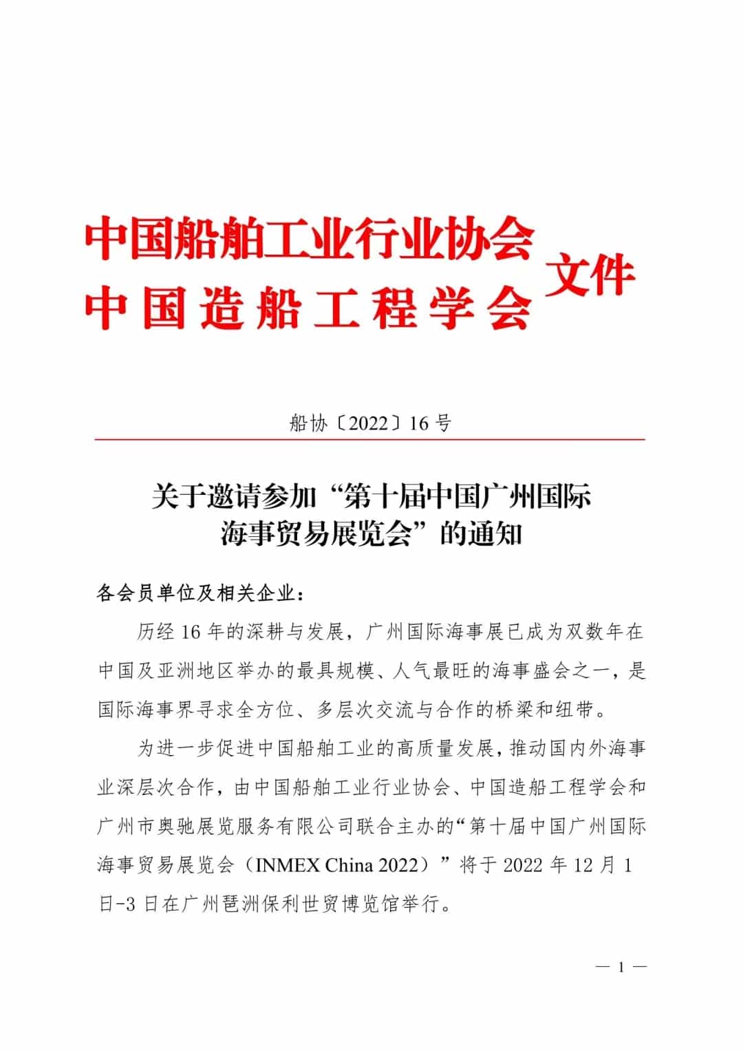 為進一步促進中國船舶工業的高質量發展,推動國內外海事業深層次合作,由中國船舶工業行業協會、中國造船工程學會和廣州市奧馳展覽服務有限公司聯合主辦的“第十屆中國廣州國際海事貿易展覽會(INMEX China 2022)”將于12月1日-3日在廣州琶洲保利世貿博覽館舉行。