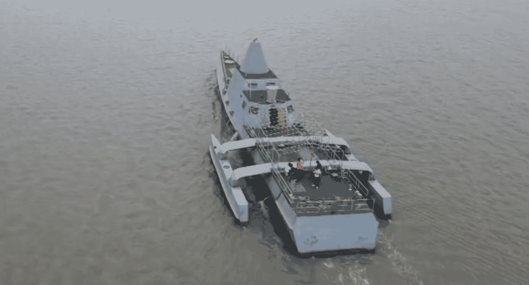 據介紹,該無人艇采用三體船型設計,總長40余米,排水量約200噸,最大航速20余節,可在5級海況正常工作,6級海況安全航行。