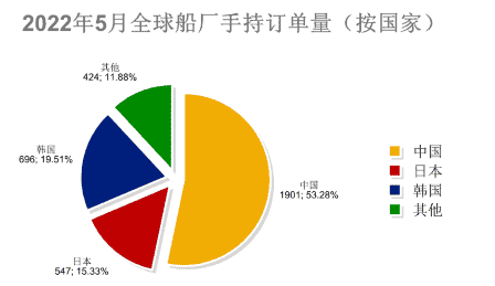 其中中國船廠手持訂單量為1901艘,艘數占全球市場份額的53.28%;日本船廠的手持訂單量為547艘,艘數占全球市場份額的15.33%;韓國船廠的手持訂單量為696艘,艘數占全球市場份額的19.51%。