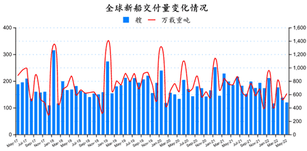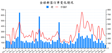 與2022年4月份相比較,數量環比減少32艘,修正總噸環比下降16.48%。