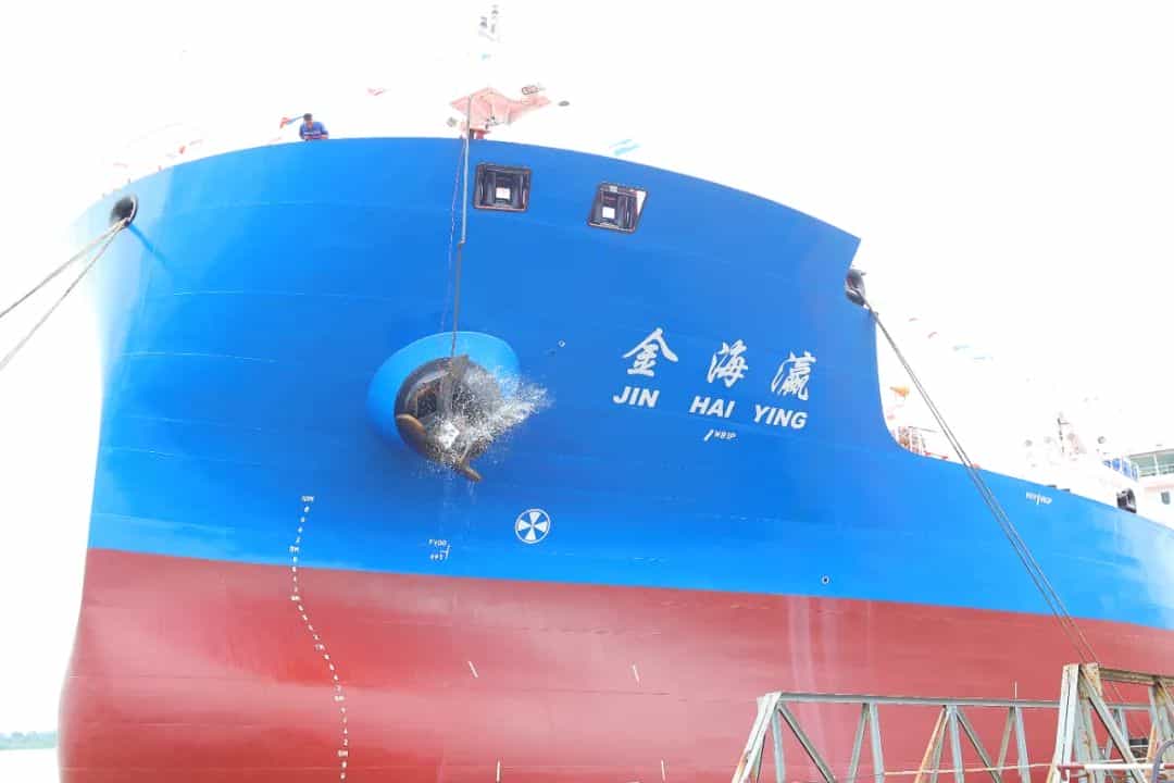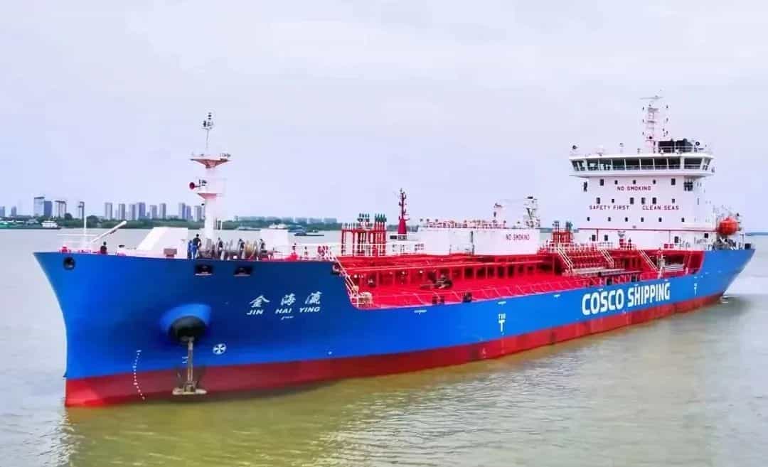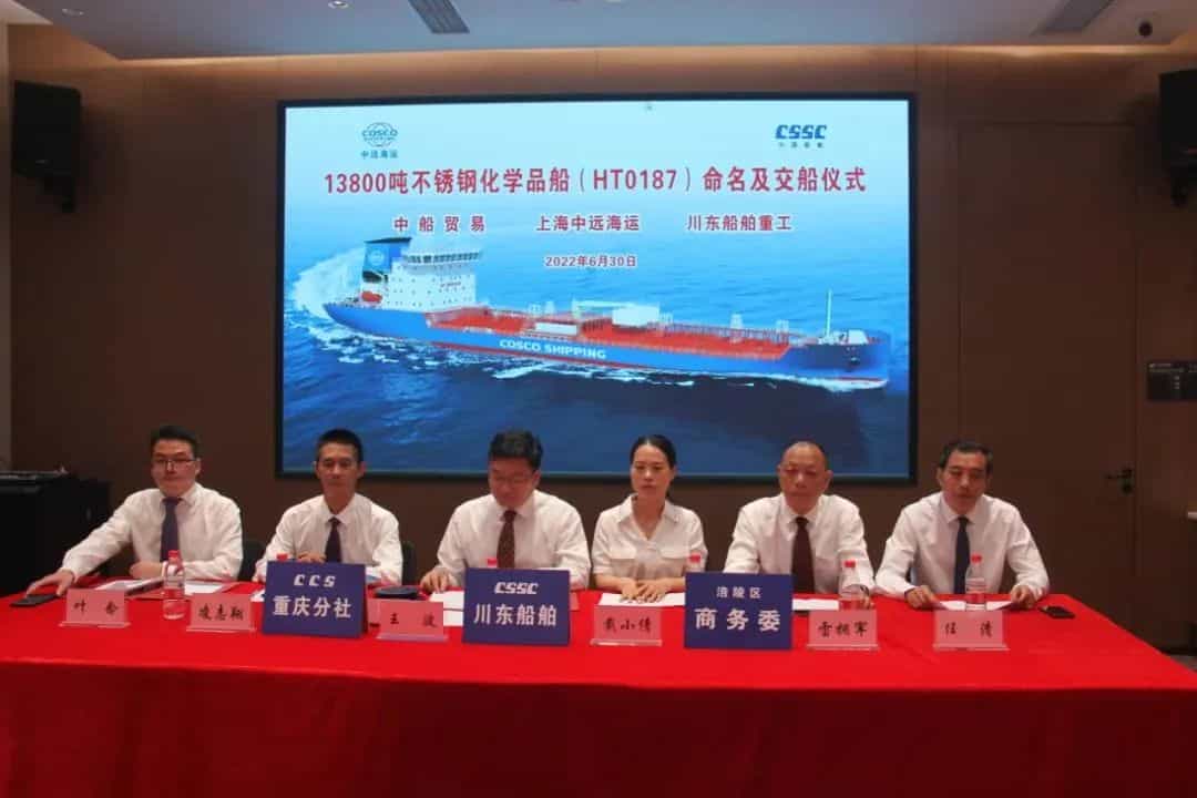日前,重慶川東船舶重工有限責任公司聯合中國船舶貿易工業有限公司,為中遠海運(上海)有限公司建造的--13800噸不銹鋼化學品船項目首制船“金海瀛”號命名交付。