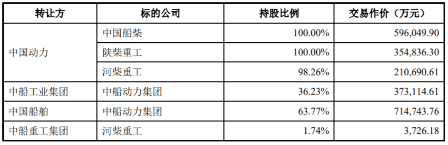 根據(jù)公告,中船柴油機向中船工業(yè)集團收購其持有的中船動力集團36.23%股權(quán),向中國船舶收購其持有的中船動力集團63.77%股權(quán),向中國動力收購其持有的中國船柴100%股權(quán)、陜柴重工100%股權(quán)、河柴重工98.26%股權(quán),并以現(xiàn)金作為對價,收購中船重工集團持有的河柴重工1.74%股權(quán)。