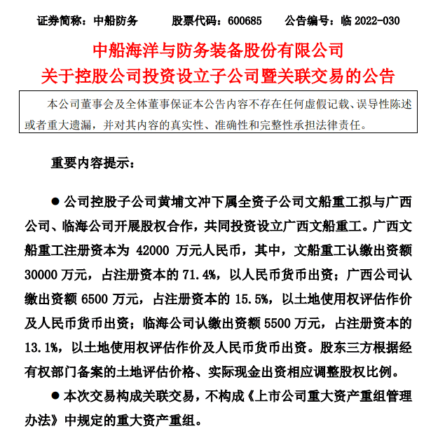 根據公告,廣西文船重工注冊資本為4.2億元人民幣,擬注冊于中國(廣西)自貿試驗區欽州港片區。