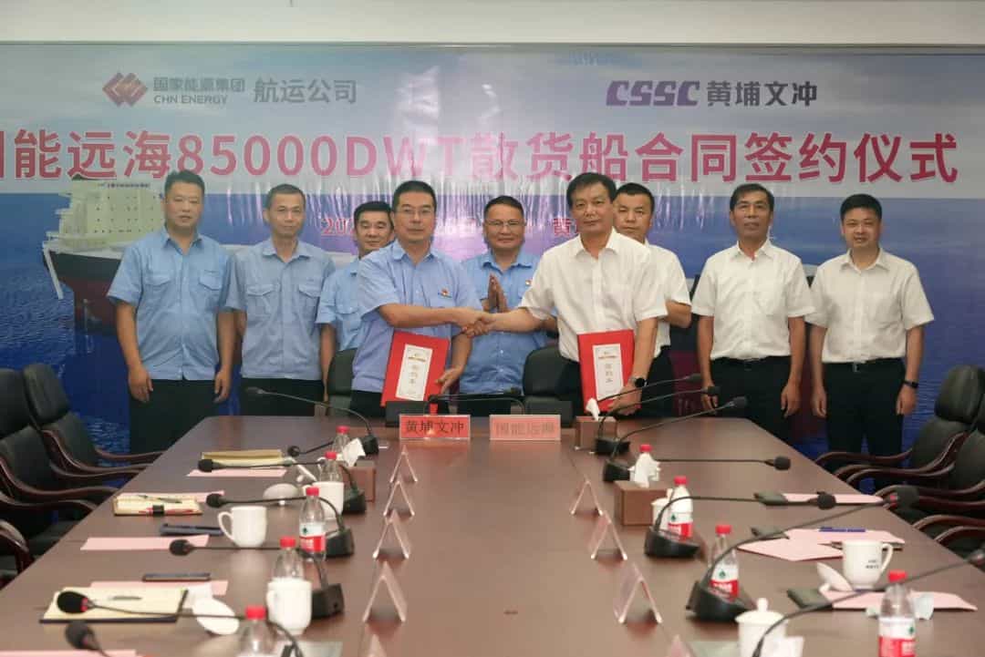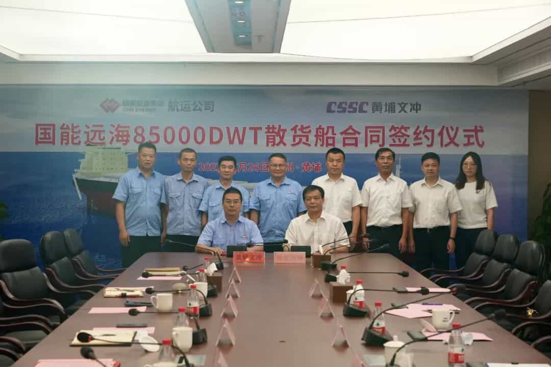 近日,中國船舶集團(tuán)旗下黃埔文沖公司和國能遠(yuǎn)海航運(yùn)有限公司,舉行兩艘“海鯨”85000DWT散貨船建造合同簽約儀式。