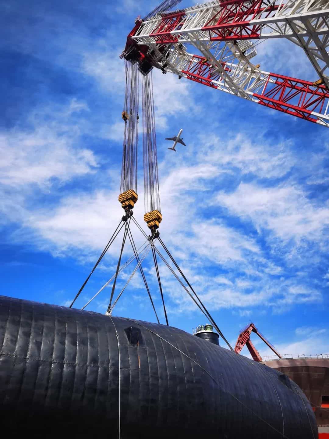 單罐重量臨近浮吊極限重量,尤其是在吊裝處于船艏位置的1號罐時,不規則形狀使其重心位置偏移。
