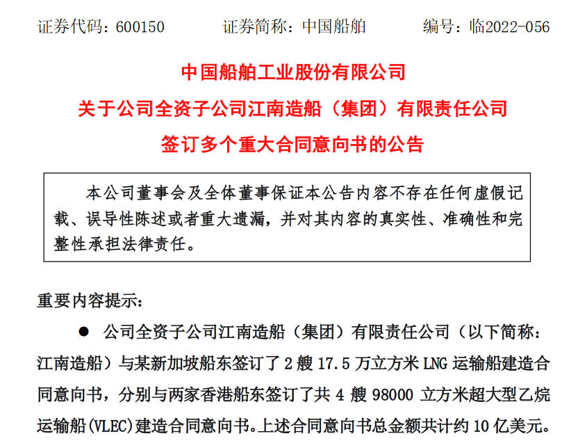 10月25日,中國船舶工業股份有限公司發布《關于公司全資子公司江南造船(集團)有限責任公司簽訂多個重大合同意向書》的公告。