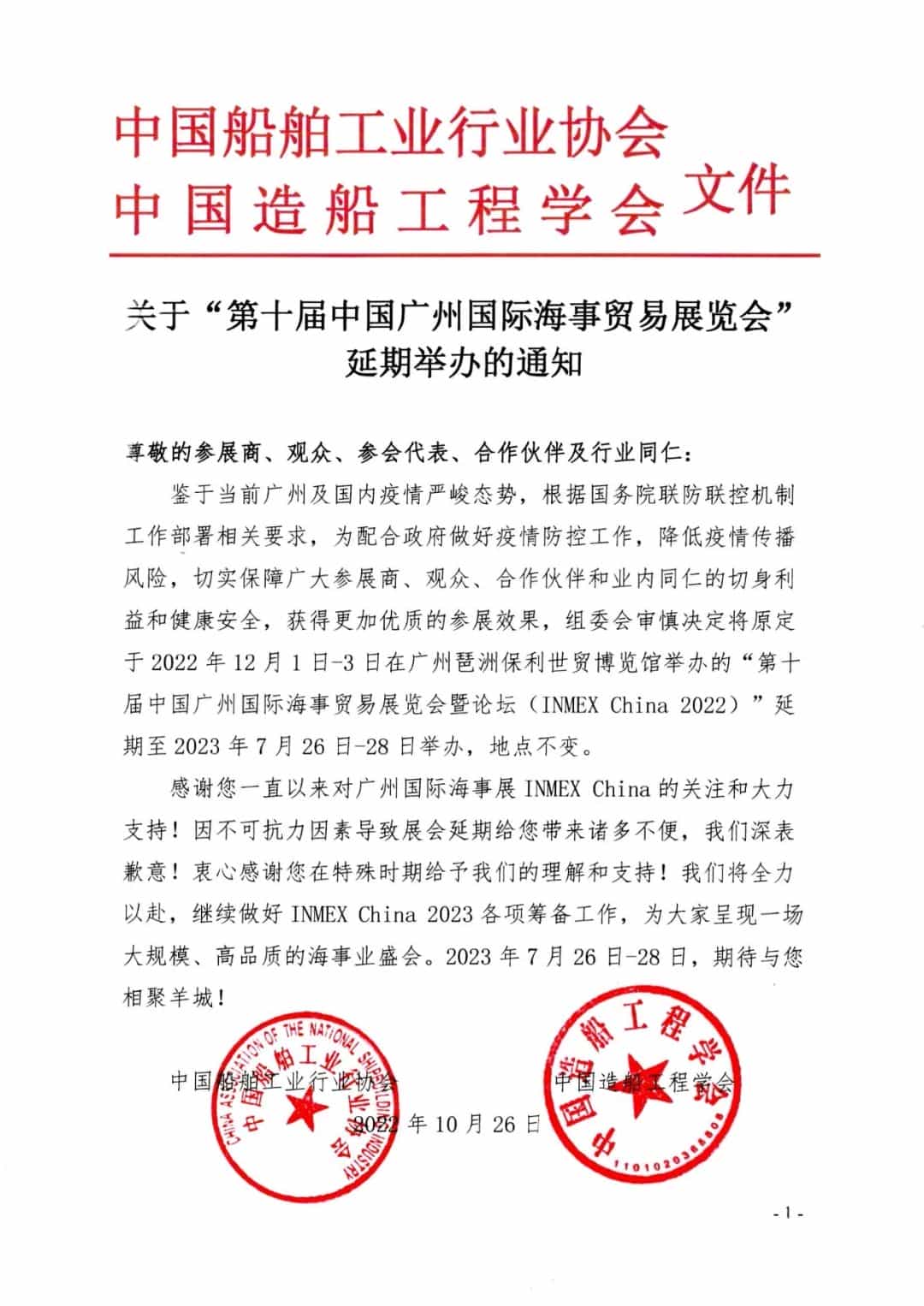 將原定于2022年12月1日-3日在廣州琶洲保利世貿博覽館舉辦的“第十屆中國廣州國際海事貿易展覽會暨論壇(INMEX China 2022)”,延期至2023年7月26日-28日舉辦,地點不變。