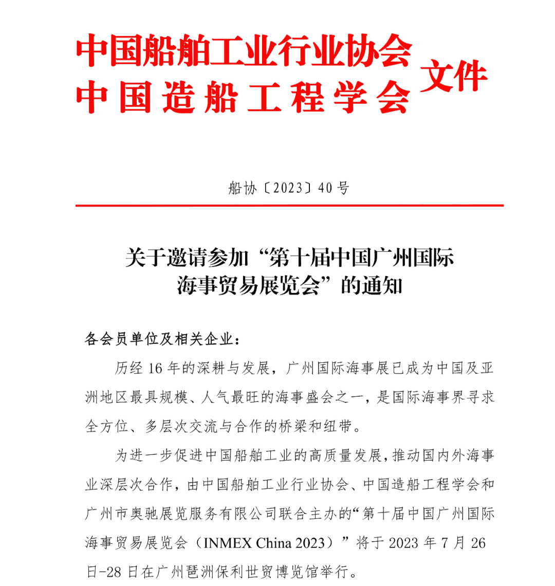 為進一步促進中國船舶工業(yè)的高質量發(fā)展,推動國內(nèi)外海事業(yè)深層次合作,由中國船舶工業(yè)行業(yè)協(xié)會、中國造船工程學會和廣州市奧馳展覽服務有限公司聯(lián)合主辦的“第十屆中國廣州國際海事貿(mào)易展覽會(INMEX China 2023)”,將于2023年7月26-28日,在廣州琶洲保利世貿(mào)博覽館一樓2號館舉行。