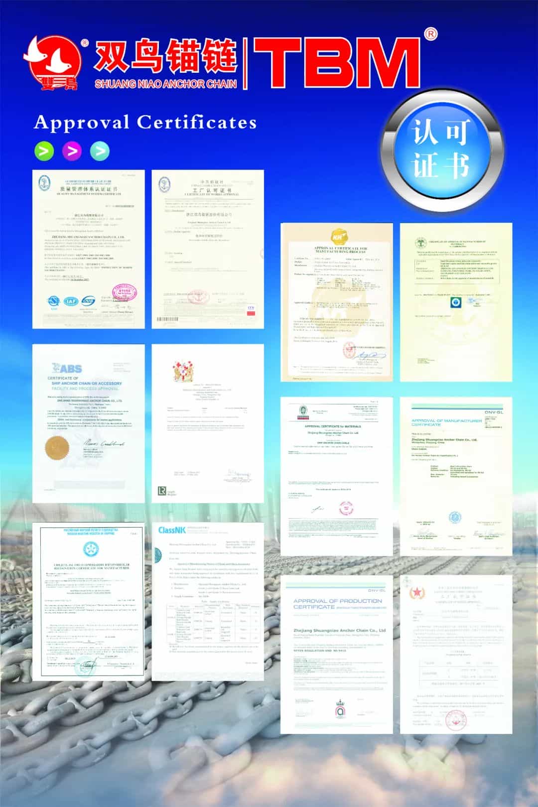 公司先后獲得中國CCS、中國船檢局ZC、中國漁檢ZY、法國BV、意大利RINA、英國LR、德國GL、挪威DNV、日本NK、韓國KR、美國ABS、俄羅斯RS的工廠及產(chǎn)品認可。