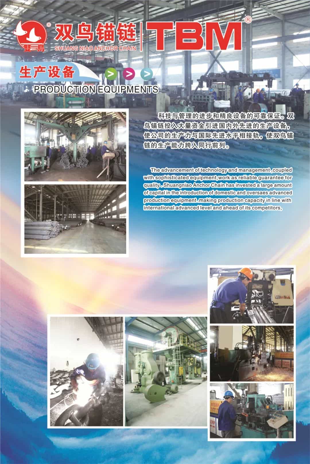 公司擁有先進的生產(chǎn)設(shè)備和檢測設(shè)備,能生產(chǎn)二、三級船用錨鏈及附件產(chǎn)品,年生產(chǎn)能力20000噸,并擁有與之配套的熱處理和拉力測試設(shè)備,能接受各種非標產(chǎn)品定制,滿足不同客戶的需求。