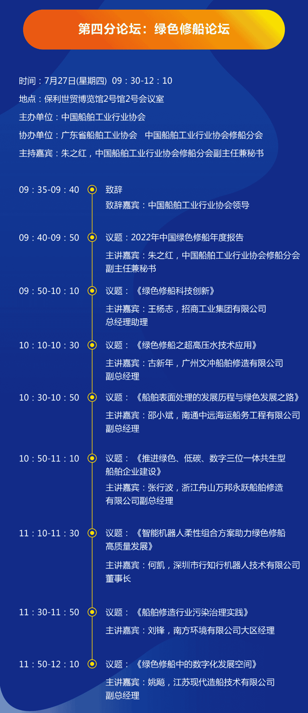 7月27日09:30-12:10 ,“2023第四屆中國(guó)船舶工業(yè)轉(zhuǎn)型升級(jí)高質(zhì)量發(fā)展論壇”第四分論壇--“綠色修船論壇”,將于廣州琶洲保利世貿(mào)博覽館2號(hào)館2號(hào)會(huì)議室召開(kāi)。