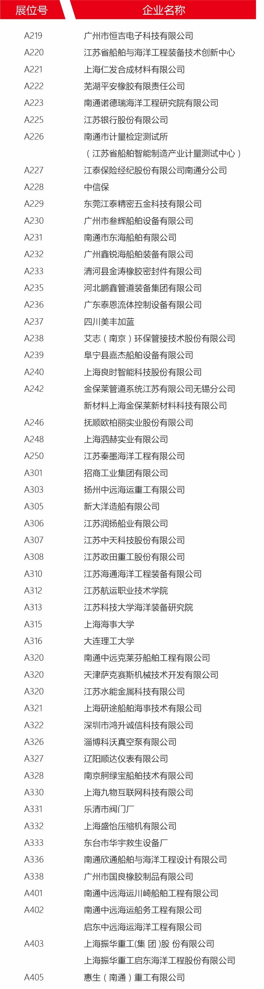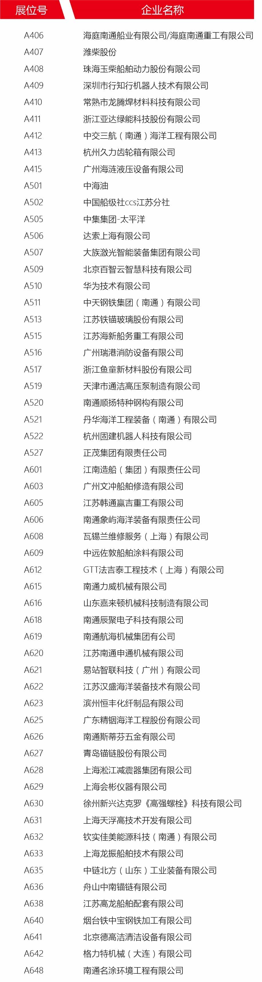 展區匯聚:瓦錫蘭、達索、GTT、中遠佐敦、霍夫曼、維薩拉、范德林、斯普瑞、大明、瀚辰精英、Winn&Coales、silverstream、JETRO、中國船舶集團有限公司第七二三研究所、中國船舶集團有限公司第七一六研究所、中船 (上海) 節能、上海船舶工藝研究所、江蘇航院、江蘇科技大學、江蘇銀行、中信保、平安、諾德瑞、大連理工、上海海事大學、南通計量中心、江蘇船海裝備創新中心、百智云、大族、華為 、濰柴、行知行、玉柴、政田、兆勝、亞星、海通、中天鋼鐵、海新、鐵錨、瑞港、漁童、亞達、久力、中交三航、通潔、丹華、順揚、龍騰、海鏈、正茂、固建、名涂、中大電纜、中運錨鏈、湃森、艾恩森、石島、德高潔、駿馬、加特林、駿馬、克萊芬、中天、恒吉、仁發、亞太、中海航、華滋、華南建材、登泰、四兄、星瑪、贏勝、遠望、海普康、雙鳥、南極、凱恩特、華生、科源、寶士達、赤士盾、翁海、超能、興輪、金鑫、中國遠洋海運、宇航、富洋、隆泰迪、特納、中天一正、歐納圖、高士、馬貝、海棱龍、鑫康能、尼可達、嘉盛、赫敦戴維洛普、迪希艾斯、科斯特、萬成、旺能、燕達、秀美、曼特拉、樸勤、萬佳、SGS、藍星、公元、亮明、榮昌、吉天、林冰、天吳、松喬、臺宇、亞泰、衛拓、巖皇、深渡、春佳、海通電子、普創、奧太、潤豐、美通、狼山、吉恩、華東動力、宏華、神韻、龍奧、吉瑞普、易俐特、斯普泰德、威信、中船澄西揚州、滬江、江泰保險、叁輝、江泰、鑫銳海、東海、泰恩、金濤、艾志、鵬鑫、良時、美豐加藍、金保萊、嘉杰、歐柏麗、秦墨、泗赫、船海書局、鴻升、順達、科沃、舸綠寶、九物、盛怡、樂清閥門、欣通、華宇、國良、力威、嘉來頓、辰聚、申通、航海、漢盛、易站、斯蒂芬、恒豐、淞江、精銦、達克羅、青島錨鏈、欽實佳美、會彬、中南、天浮、高龍、龍振、鐵中寶、中鏈、格力特等200多家國內外船舶海工配套和服務企業參展,帶來新產品、新技術、新服務,一同助力產業深度融合,推動行業高質量發展。