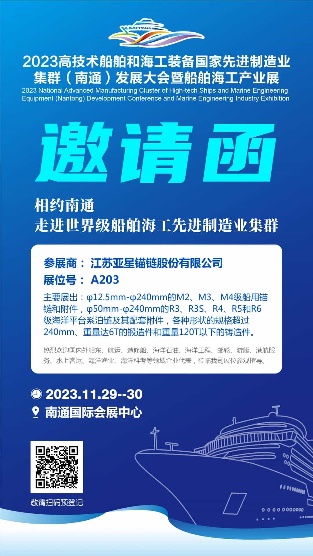 2023年11月29-30日,南通國際會展中心A203展位,亞星錨鏈與全球船舶人相約南通,走進世界級船舶海工先進制造業集群!