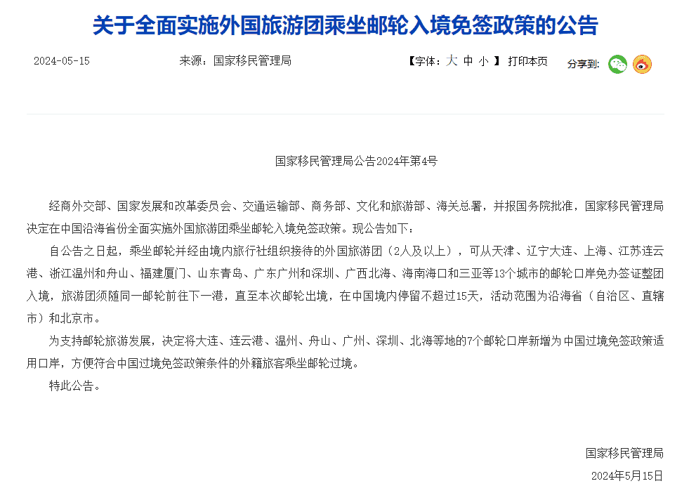 根據(jù)公告,從2024年5月15日起,乘坐郵輪并經(jīng)由境內(nèi)旅行社組織接待的外國旅游團(2人及以上),可從中國13個城市的郵輪口岸免辦簽證整團入境停留不超過15天。