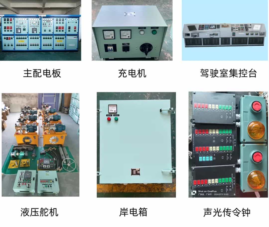 飛電船舶主要產品有交直流主配電板(含并車)、駕駛室集中控制臺、變壓器、分配電箱、岸電箱、磁力起動器、充放電板、充電機、聲光傳令鐘、組合式起動控制屏、錨機控制箱、起貨機控制箱、電動液壓舵機、液壓擋沙板、拉沙閘、船用液壓配件、火災報警系統、燈具、電纜、遙控按鈕盒、插座箱、插頭、插座、開關、冷藏插座箱以及其他各種類非標控制箱等。