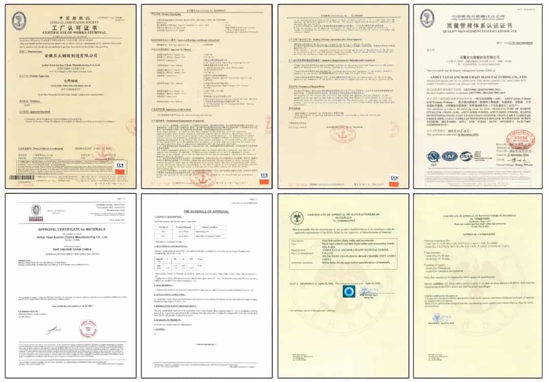 亞太錨鏈產品嚴格按照國家標準和船級社焊接規范要求生產,先后通過了GB/T19001-2016/IS09001: 2015質量管理體系的認證,獲得中國、俄羅斯、法國、美國、印度、德國、挪威、日本、韓國、德國、意大利等多國船級社的認證,以及地方船檢、漁檢認證。