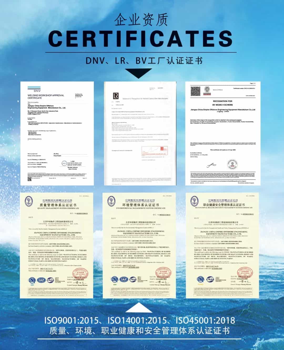 Our company has obtained Quality, Environmental,Occupational health and Safety Management System certificate and factory approval certificate of DNV-GL, BV, LR classification society.