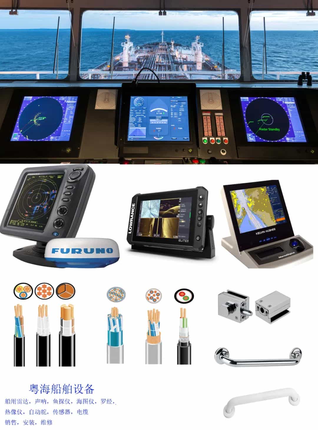 粵海主營產品包含:雷達、聲吶、魚探儀、海圖儀、羅經、自動舵、熱像儀、傳感器、計程儀、AIS船舶自動識別系統、VHF/AIS甚高頻超高頻無線電、海洋衛星電話、船用電纜和電線、船舶機械安裝維修、機電維修、計算機和顯示器、建筑材料和消防器材等。